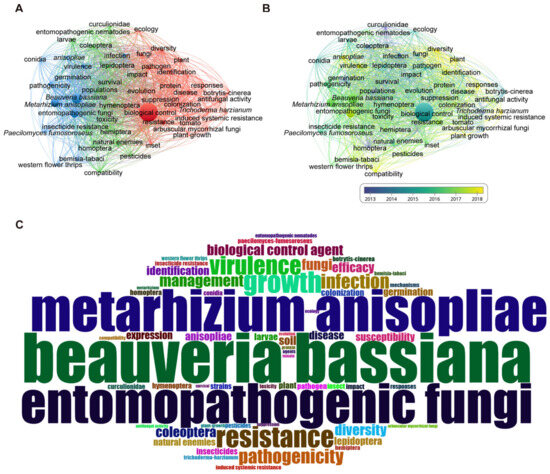 Keywords co-occurrence map on fungi as BCAs and biofertilisers. (A) Keywords co-occurrence network map. The blue sections illustrate the role of fungi as BCAs and biofertilisers in the comprehensive management of plant pests. The green section provides the types of pests that fungi can eliminate. The red sections of the analysis highlight the application of fungi as BCAs and biofertilisers in the effective control of plant diseases. (B) Co-occurrence network map of the year of occurrence (Frequency 100). Different colours correspond to different years. The closer the colour is to yellow, the more recent the year it represents. (C) Word cloud of keywords. The size of the font indicates the frequency of keyword occurrences. The larger the font, the higher the frequency. The circle indicates the frequency of keyword occurrence.