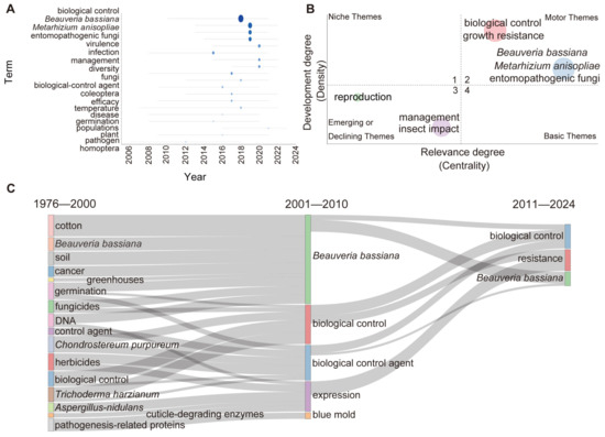 In addition, we visualised the development of keywords across three distinct periods (1976–2000, 2001–2010, and 2011–2024) using Sankey diagrams (Figure 6C). The keywords “Beauveria bassiana” and “biocontrol” appeared in all three stages, further confirming their importance in this field. In the first stage (1976–2000), the keywords were mainly basic keywords in this field and research on fungi, such as Chondrostereum purpureum and Trichoderma harmzianum. In the second stage (2001–2010), the research in this field focused mainly on B. bassiana. In addition to B. bassiana, biological controls, BCA, and their expression have also become research hotspots. The research focus of the third stage (2011–2024) was similar to that of the second stage (2001–2010), and further research was conducted on B. bassiana in biocontrol. Although B. bassiana and M. anisopliae are present in various ecosystems, B. bassiana tends to be dominant in natural habitats because it is susceptible to disturbances such as soil tillage and agricultural practices [55,56,57,58]. This may partly explain why research on B. bassiana is more prevalent than on M. anisopliae.
