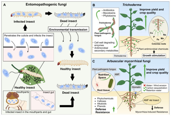 Mechanism of fungi as BCAs and biofertilisers. (A) Mechanism and effect of EPF as BCAs (insecticides). (B) The biocontrol mechanism and effect of Trichoderma in controlling plant pathogens and promoting crop health. (C) Mechanism and effect of AMF in controlling plant diseases and promoting plant growth. Figures created with BioRender.com.