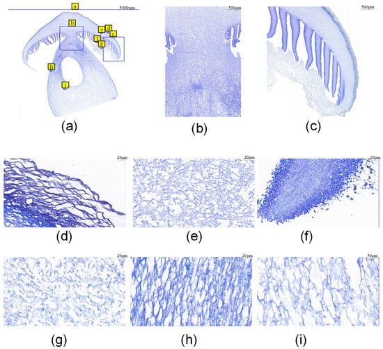 Observation of fruiting body structure of S. rugosoannulata; (a) The overall structure of S. rugosoannulata fruiting body, the letters and blue boxes indicate the position of the a–i structure in the fruiting body; (b) the structure of the connection between the stipe and the pileus; (c) pileipellis, pileus, and veil junction structure; (d) pileipellis structure; (e) pileus structure; (f) gill structure; (g) veil structure; (h) stipe structure; (i) trama structure.