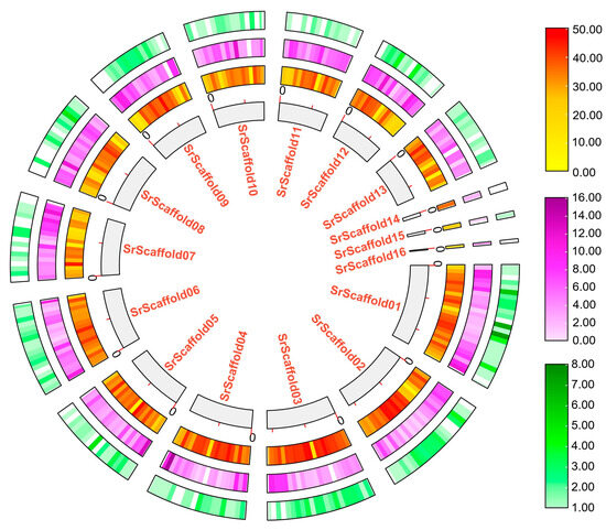 Characteristics of new gene annotation in the S. rugosoannulata genome; from the inner circle to the outer circle, the genome length, the gene density of the genome (v.1.0), the new gene density of the genome (v.2.0), the transcription factors, and the protein kinases found in the genome (v.2.0).