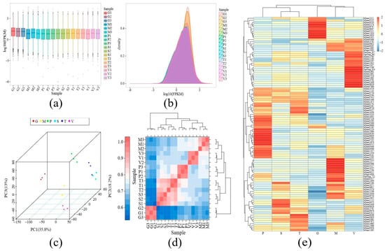 The relationship of the transcriptome in different tissues of S. rugosoannulata. (a) represents the FPKM density distribution comparison map of different tissues; (b) represents the FPKM box plot of different tissue samples; (c) represents the principal component analysis diagram, with different coordinates representing different principal components, the percentage representing the contribution value of the corresponding principal component to the sample difference, each point representing a sample, and different groups of samples represented by different colors; (d) represents the expression correlation heat map of different tissue samples; (e) represents the 100 genes with the highest expression in fruiting body tissues.