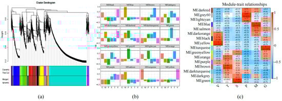 The relationship of the transcriptome in different tissues of S. rugosoannulata; (a) WGCNA module tree diagram, and different gene modules represented by different colors; (b) 16 co-expressed gene modules identified by WGCNA. The histogram was generated based on the ME values of all 16 modules, X-axis, different tissues, Y-axis, and ME values, and different groups of samples represented by different colors; (c) the correlation between modules and organizations. The correlation heat map of co-expressed gene modules with 6 tissues has a numerical Pearson correlation coefficient (upper) and corresponding p-value (lower). The color scheme, from red to white to blue, indicates the level of correlation from high to low.