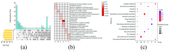 Biological process and KEGG analysis of genes in different tissues of S. rugosoannulata; (a) upset diagram of GO enrichment (biological process, BP) in different tissues; (b) main GO enrichment (BP) of each tissue gene base; (c) KEGG enrichment of each tissue gene base.