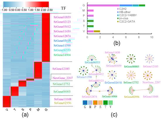 Tissue-specific expression of transcription factors in different tissues of S. rugosoannulata; (a) Specific expression of transcription factors in different tissues, wherein the gene name of the same color represents the same gene family and the family information is the same as in (b); (b) gene families and numbers of transcription factors specifically expressed in different tissues; (c) top 10 regulatory genes of specific expression of transcription factors in different tissues.