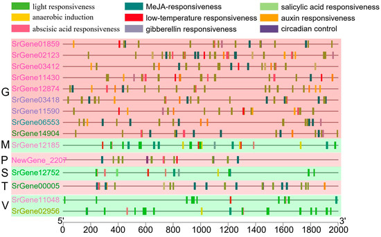 To investigate the potential biological functions of distinct tissue-specific transcription factors, cis-acting elements in the 2000 base pairs (bp) region upstream of the gene promoter were identified using the PlantCARE tool (Figure 8). The promoter region of NewGene_2207 contains cis-elements associated with light responsiveness, methyl jasmonate (MeJA) responsiveness, abscisic acid responsiveness, circadian control, and low-temperature responsiveness. In contrast, SrGene00005 manifests MeJA-responsiveness, light responsiveness, abscisic acid responsiveness, and auxin responsiveness within its promoter region. Furthermore, the SrGene12752 promoter region contains cis-elements for light responsiveness, abscisic acid responsiveness, MeJA-responsiveness, anaerobic induction, low-temperature responsiveness, gibberellin responsiveness, and salicylic acid responsiveness. The promoter regions of both SrGene02956 and SrGene11048 contain cis-elements of light responsiveness, MeJA-responsiveness, abscisic acid responsiveness, low-temperature responsiveness, and anaerobic induction. Conversely, SrGene012185 exhibits a distinct profile, containing light responsiveness, MeJA-responsiveness, abscisic acid responsiveness, anaerobic induction, and low-temperature responsiveness. The promoters of genes specifically expressed in gill predominantly contain cis-elements associated with gibberellin responsiveness, light responsiveness, MeJA-responsiveness, abscisic acid responsiveness, anaerobic induction, auxin responsiveness, low-temperature responsiveness, gibberellin responsiveness, salicylic acid responsiveness. The collective analysis of these results indicates that transcription factors originating from disparate tissues assume pivotal functions in the growth and development of S. rugosoannulata, as well as in its response to adverse environmental conditions.