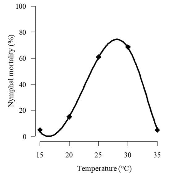 The Ratkowsky 1 model had a good fit to the mortality data, and the model adjusted for the mortality versus temperature is shown in Figure 5. The nonlinear model predicted an optimal temperature for higher mortality of B. tabaci nymphs by C. javanica at 28.1 °C.