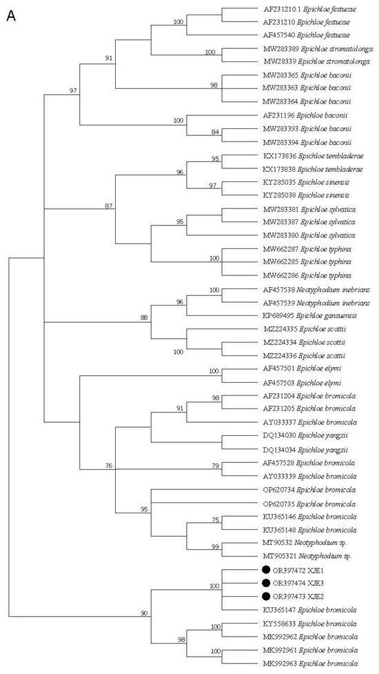 - Leuchtmann, A.; Schardl, C.L. Genetic Diversity of Epichloë Endophytes Associated with Brachypodium and Calamagrostis Host Grass Genera including Two New Species. J. Fungi 2022, 15, 1086. [Google Scholar] [CrossRef]