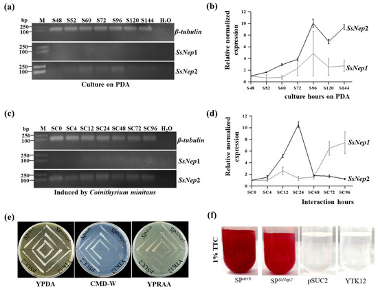 Expression of SsNEP1 and SsNEP2 in S. sclerotiorum. (a) RT-PCR detection of the gene expression of SsNEP1 and SsNEP2 in S. sclerotiorum cultured on PDA. S48, S52, S60, S72, S96, S120, and S144 represent the incubating stage of S. sclerotiorum on PDA for 48 h, 52 h, 60 h, 72 h, 96 h, 120 h, and 144 h, respectively. β-tubulin was used as a reference. H2O was used as the negative control. M: DNA ladder DL2000 (TaKaRa, Dalian, China). The primer pairs were Rt-SsNEP2-F/R for SsNEP2 and Rt-SsNEP1-F/R for SsNEP1. The primer sequences are listed in Table 1. (b) Fluorescence quantitative PCR detection of gene expression of SsNEP1 and SsNEP2 in S. sclerotiorum cultured on PDA. The normalized gene expression at 48 h was set as 1. The expression of β-tubulin was used to normalize different samples. (c) The expression of SsNEP1 and SsNEP2 in S. sclerotiorum induced by C. minitans at different stages. SC0, SC4, SC12, SC24, SC48, SC72, and SC96 represent the interaction stages of S. sclerotiorum with C. minitans for 0 h, 4 h, 12 h, 24 h, 48 h, 72 h, and 96 h, respectively. (d) The transcript level of SsNEP1 and SsNEP2 in S. sclerotiorum induced by C. minitans at different stages. The normalized gene expression at 0 h was set as 1. (e) Secretory identification of SsNEP2 using the yeast secretion trap system. SPAvrb is the positive control. pSUC2 is the empty vector control. YTK12 is the yeast control. (f) Color identification of the samples from (e) by TTC. TTC is 2,3,5-triphenyltetrazolium chloride. TTC changed from colorless to red, indicating a responsive activity.