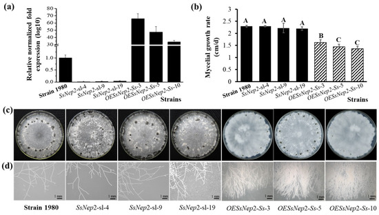 SsNEP2 mutants of S. sclerotiorum. (a) The transcript level of SsNEP2 cultured for 36 h on PDA. Three silencing mutants are represented as SsNEP2-sl-4, SsNEP2-sl-9, and SsNEP2-sl-19. OESsNep2-Ss-3, OESsNep2-Ss-5, and OESsNep2-Ss-10 represent the overexpressed transformants of S. sclerotiorum. (b) Radial growth of all the strains on PDA. The significance level is p < 0.01 and the significant differences are distinguished by capital letters of A, B and C at the top of bar chart. (c) Colony morphology of all the strains cultured on PDA for 7 days at 20 °C. (d) Hyphal tips of all strains growing on PDA for 36 h.