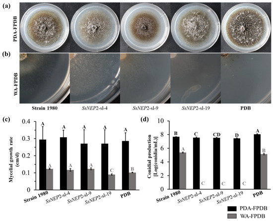 C. minitans affected by SsNEP2. (a) Colony morphology of C. minitans strain ZS-1 incubated at 20 °C for 15 days on PDA-FPDB (PDA amended with an equal volume of filter fermentation broth of S. sclerotiorum shaken in PDB for four days). (b) Colony morphology of C. minitans strain ZS-1 incubated at 20 °C for 15 days on WA-FPDB (water agar culture amended with filter fermentation broth of S. sclerotiorum). (c) Mycelial growth of C. minitans on PDA-FPDB and WA-FPDB. The significance level is p < 0.01 and the significant differences are distinguished by capital letters of A, B and C at the top of bar chart. (d) Conidiation of C. minitans cultured on PDA-FPDB or WA-FPDB with 15 days. The significance level is p < 0.01 and the significant differences are distinguished by a capital letter at the top of bar chart.