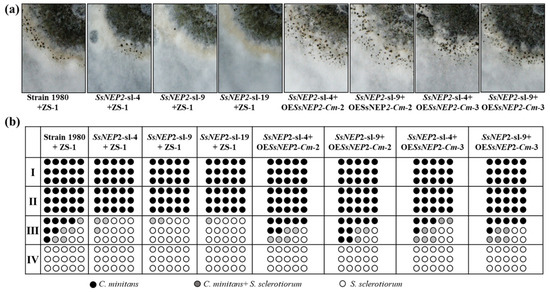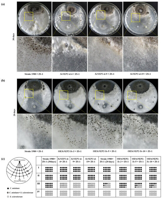 Mycelial parasitism between SsNEP2 silencing transformants of S. sclerotiorum and expression mutants of C. minitans. (a) Dual culture of C. minitans and S. sclerotiorum for 20 days under 20 °C. ZS-1 represents the C. minitans strain ZS-1. (b) Results of the dual culture of (a). Schematic diagram showing the number of agar disks that gave rise to either C. minitans (black circle), S. sclerotiorum (hollow circle), or both (gray circle). Each circle represents a colony developed from a mycelial agar disk sampled from zones I, II, III, or IV between the inoculation sites of C. minitans and S. sclerotiorum in a dual culture.