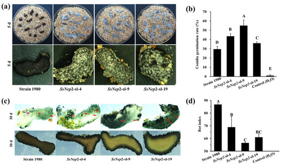 Parasitism of C. minitans to the sclerotia of S. sclerotiorum. (a) Sclerotia of SsNEP2 silencing mutants were covered with mycelia of C. minitans after inoculation with C. minitans conidia for 5 days at 20 °C. Strain 1980 is S. sclerotiorum strain 1980 (b) The conidial germination rate of C. minitans cultured in sclerotial soaked for 24 h at 20 °C. (c) Sclerotia of S. sclerotiorum parasitized by C. minitans 30 days after inoculation. Pycnidia formed on the surface of sclerotia (red arrows). (d) Rot index of sclerotia of the silencing SsNEP2 mutants parasitized by C. minitans. The surface-sterilized sclerotia of mutants and strain 1980 of S. sclerotiorum were submerged into the conidial suspension of C. minitans for 30 min, half-buried in sterilized wet sand in plates, and incubated for 30 days at 20 °C. Twenty sclerotia with five repeats were used for each strain, and the experiment was repeated twice independently. The rot index of sclerotia was evaluated according to the described method [41]. The significance level is p < 0.01 and the significant differences are distinguished by a capital letter at the top of bar chart.