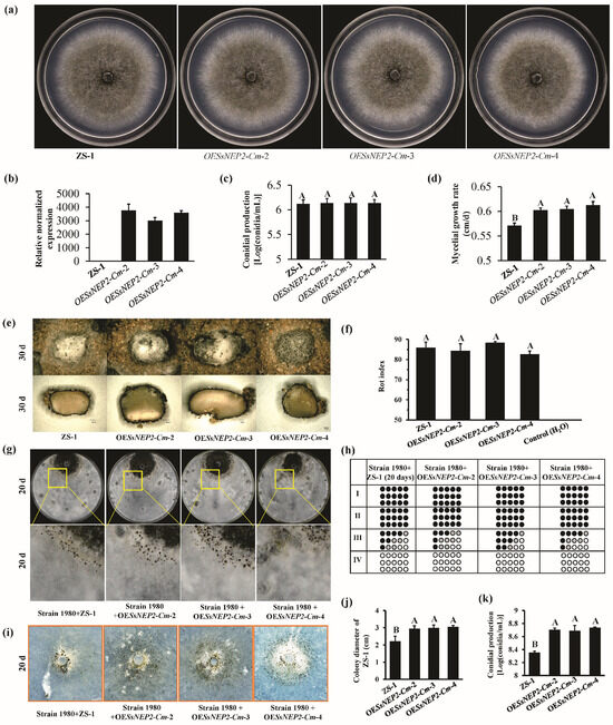 Three overexpressed mutants in C. minitans, namely OESsNep2-Cm-2, OESsNep2-Cm-3, and OESsNep2-Cm-4, were used to explore the function of SsNEP2 during the mycoparasitic process. A similar rot index of sclerotia and parasitism to the mycelia of S. sclerotiorum by dual culture was observed among all strains of C. minitans cultured on PDA (Figure 6e–h). However, when growing on the colony of S. sclerotiorum for 20 days, the average colony diameter of OESsNEP2-Cm-2, OESsNEP2-Cm-3, and OESsNEP2-Cm-4 was 2.94 cm, 2.99 cm, and 3.05 cm, which was significantly larger than that of strain ZS-1 (2.22 cm) (Figure 6i,j), and more conidia were formed by overexpressed mutants of C. minitans than strain ZS-1 (Figure 6k). Therefore, the overexpression of SsNEP2 in C. minitans improves mycoparasitic ability against mycelia of S. sclerotiorum and conidial production there.