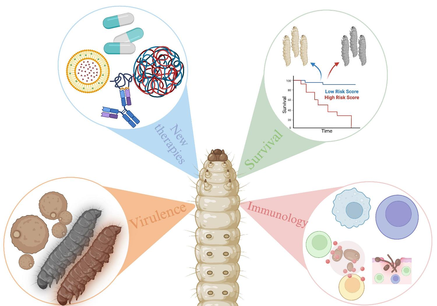 | Cryptococcus neoformans var. grubii | 100–200 mg | 5 × 106 cells/larva | 10 μL | [48] |