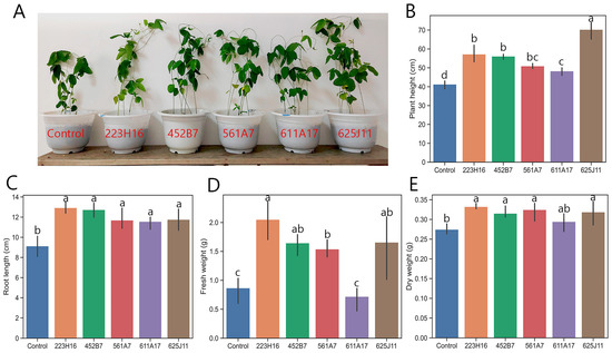 The moistened filter paper plate method was used to assess the growth-promoting effects of 37 Trichoderma strains with good antagonistic capabilities on soybean seeds. The results revealed that five Trichoderma strains, namely, 223H16, 452B7, 561A7, 611A17, and 625J11, exhibited significant abilities to promote soybean germination and growth. The plants treated with different Trichoderma agents exhibited varying degrees of growth-promoting effects (Figure 1). In terms of plant height, soybean plants treated with the 223H16, 452B7, 561A7, 611A17, and 625J11 strains exhibited significant increases in height compared to the control group (p < 0.05). Among them, the 625J11 strain showed the most significant growth-promoting effect, with an increase of 58.73% compared to the control. The other strains, including 223H16, 452B7, 561A7, and 611A17, resulted in height increases of 33.10%, 32.31%, 21.86%, and 14.62%, respectively, compared to the control. The 452B7 strain showed the most significant increase in root length, with a 21.52% improvement compared to the control. Additionally, the 223H16, 561A7, 611A17, and 625J11 strains also significantly enhanced root elongation in soybean, with increases of 20.58%, 17.76%, 15.79%, and 18.61%, respectively, compared to the control (p < 0.05). In terms of dry weight, soybean plants treated with the 223H16 strain showed the highest dry weight, with a 21.00% increase compared to the control (p < 0.05). There were no significant differences in dry weight between the 611A17 strain treatment and the control group, while the rest of the strain treatments showed significant increases compared to the control (p < 0.05). Regarding the fresh weight of soybean plants, except for the 611A17 strain, which showed no significant difference compared to the control, the other four Trichoderma strains significantly increased the fresh weight of soybean plants (p < 0.05). Among them, the 223H6 strain showed the most significant difference compared to the control, with a remarkable increase of 70.77%.