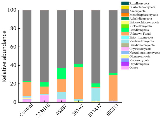 Differences in fungal community compositions among Trichoderma treatments. This column chart displays the relative abundances of species at the phylum level.
