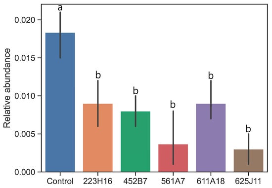 Due to the complexity and variability of field conditions, as well as the instability of the external environment, biological control agents can effectively manage soybean root rot and promote plant growth under potting conditions, but the same effects may not be observed in the field. The effectiveness of microbial agents in the field largely depends on their ability to colonize and proliferate at the plant root zone [25]. The colonization of microbial agents can be influenced not only by their own colonization characteristics but also by various environmental factors such as temperature, humidity, light, and the nutritional status of the plants, which in turn affects the efficacy of these agents in controlling plant diseases [26]. Bandeira et al. evaluated the impact of five species of Trichoderma inoculated on the leaves and roots of eucalyptus on plant growth. The results indicated that root inoculation with Trichoderma contributed to nutrient absorption and promoted eucalyptus growth, demonstrating good colonization characteristics [27]. In this study, the percentage of Trichoderma at the genus level in the treatment groups 452B7, 611A17, and 625J11 applied in soybean planting areas was significantly higher than in the control group, suggesting that the increase in relative abundance of these three Trichoderma species may be due to the applied Trichoderma, which also confirms the good colonization performance of biocontrol Trichoderma in soybean rhizosphere soil.