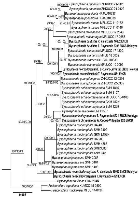 The concatenated ITS, LSU, SSU, and tef1-α datasets comprise 41 taxa with 3019 characters, including gaps. The three phylogenetic analyses (MP, ML, and BI) of the datasets showed similar topologies (Figure 1). No significant conflicts (bootstrap value > 80%) were detected among the topologies obtained via individual phylogenetic analyses. The ILD test comparing the nuclear markers yielded a p-value of 0.12, indicating congruence among the nuclear datasets. For this reason, a combined dataset was used for the analysis. The best-fit models of the Bayesian analysis of the combined dataset were GTR + F + I + G4 for ITS, LSU, and tef1-α, and HKY + F + G4 for SSU. The parsimony analysis of the alignment found 1024 trees of 187 steps (CI = 0.1005, HI = 0.1004, RI = 0.2034, RC = 0.1380). We present the best RAxML tree, with a final likelihood value of 26,080.008214. The matrix had 962 distinct alignment patterns, with 3.02% undetermined characters or gaps. The estimated base frequencies were as follows: A = 0.109024, C = 0.102731, G = 0.100074, T = 0.100210; substitution rates AC = 1.000300, AG = 1.002045, AT = 1.000301, CG = 1.000844, CT = 4.000932, and GT = 1.1000000; the gamma distribution shape parameter was α = 0.000721. The standard deviation between chains in the Bayesian analysis stabilized at 0.001 after 4.5 million generations. No significant changes in tree topology trace or cumulative split frequencies of the selected nodes were observed after about 0.25 million generations and were discarded as a 25% burn-in. The phylogenetic exhibited Byssosphaeria bautistae, Byssosphaeria chrysostoma, Byssosphaeria neoschiedermayriana, and Byssosphaeria neorhodomphala and formed a monophyletic group (BS = 100%, BS = 100%, BI p = 1) (Figure 1).