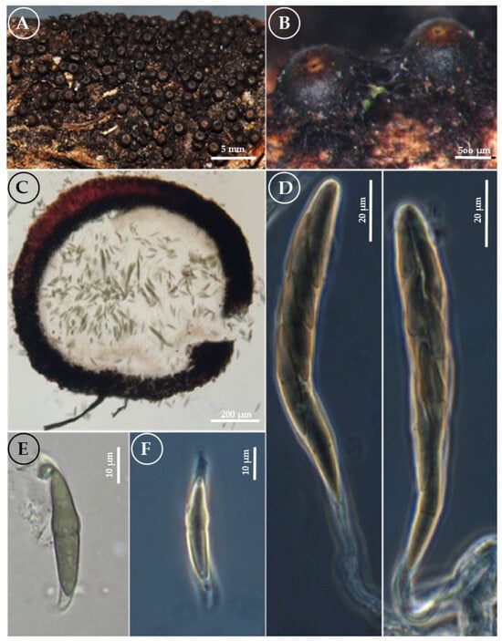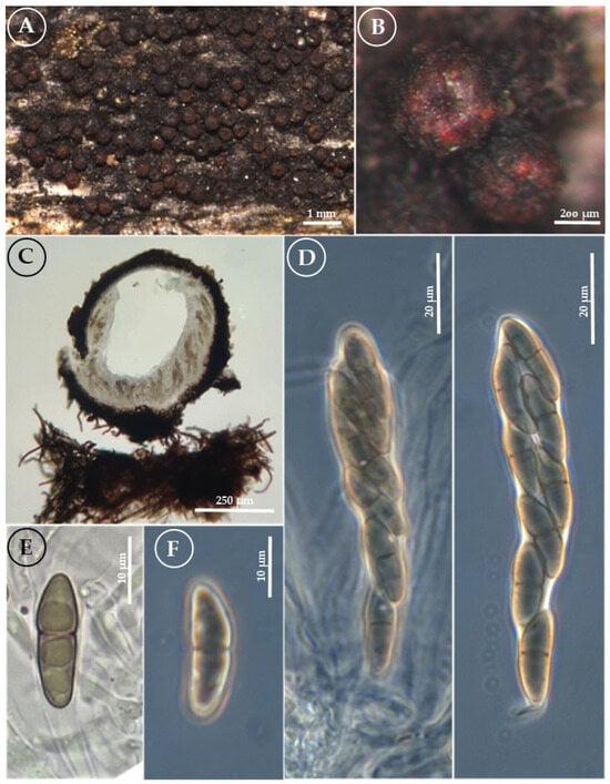 Byssosphaeria bautistae (T. Raymundo 6308, holotype). (A) Pseudothecia on the host surface/appearance of ascomata on the host; (B) close-up of pseudothecia and color around the ostiole; (C) longitudinal section of the pseudothecia and peridium; (D) asci; (E) ascospores with KOH; and (F) ascospores (phase-contrast).