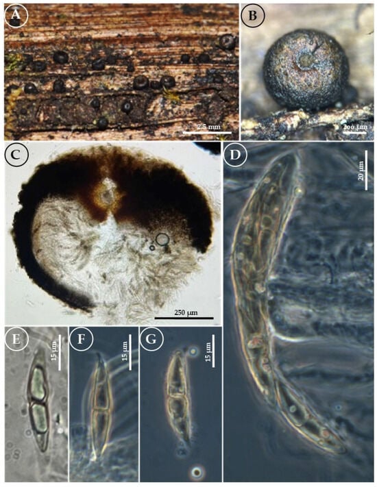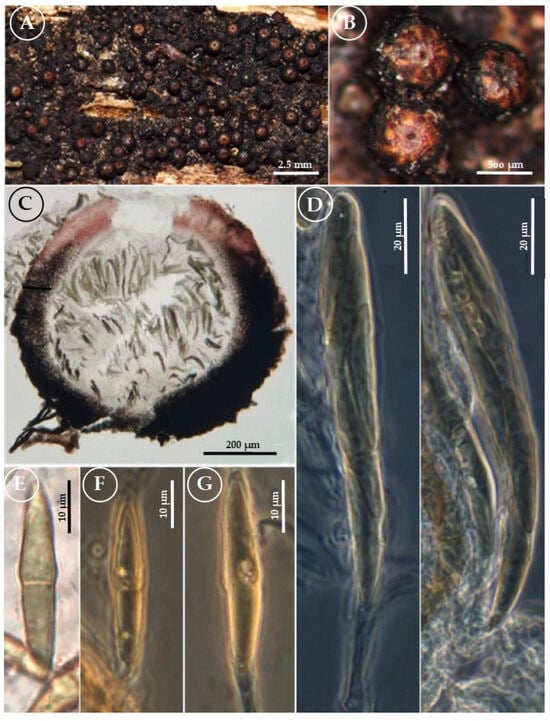 Byssosphaeria neoschiedermayriana (R. Valenzuela 16092, holtype). (A) Pseudothecia on the host surface/appearance of ascomata on the host; (B) close-up of pseudothecia, color around the ostiole; (C) longitudinal section of the pseudothecia and peridium; (D) asci; (E) ascospores with KOH; and (F,G) ascospores (phase-contrast).