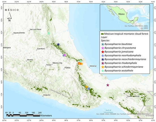 Byssosphaeria presents high taxonomic richness in Mexico, being one of the best-studied genera of Dothideomycetes in the country. The four new species described in this study are distributed in Hidalgo, Puebla, and Oaxaca, located in the Sierra Madre Oriental, Trans-Mexican Volcanic Belt, and Sierra Madre del Sur, in mountainous areas characterized by abrupt topography and high beta diversity (Figure 6). Mexican TMCF has been considered essential for maintaining biodiversity due to the richness and endemism of fungi. Important centers of speciation and differentiation of fungi resulting from the comprehensive impacts of the upward thrust of mountains, development, and climate fluctuations in geographic history TMCFs, are the most threatened terrestrial ecosystems at the national level, so they have been classified as “habitats in danger of extinction”.