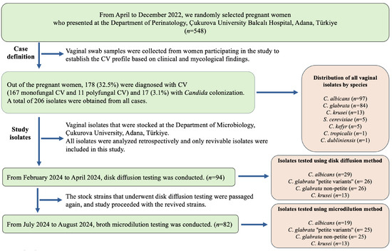 These findings motivated us to explore the presence of C. glabrata “petite variants” in our vaginal stock collection from pregnant women and to compare the antifungal testing results with those of their parent isolates. The available C. albicans and non-C. albicans strains were also investigated using the disk diffusion and broth microdilution methods to reveal epidemiological data in Adana, Türkiye. Specifically, both tests were performed at pH 4 and 7, and the results were compared. Additionally, the suitability and reliability of the disk diffusion method were assessed. The findings of the present study could enhance our understanding of the antifungal susceptibility profiles of “petite variants” of C. glabrata in vaginal isolates.