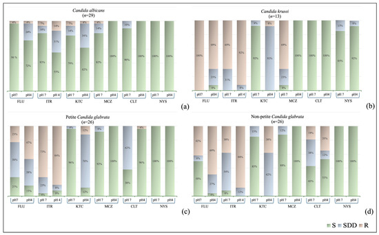 Disk diffusion method results of vaginal Candida isolates at pH 4 and pH 7: (a) Candida albicans, (b) Candida krusei, (c) petite Candida glabrata, (d) non-petite Candida glabrata. S, Susceptible; SDD, Susceptible-dose-dependent; R, Resistant. FLU, Fluconazole; ITR, Itraconazole, CLT; Clotrimazole, KTC, Ketoconazole; MCZ, Miconazole; NY, Nystatin.