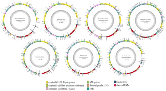 The annotation of protein–coding genes (PCGs), introns, rRNA genes, and tRNA genes of the mitogenome was conducted using the MFannot (https://megasun.bch.umontreal.ca/apps/mfannot/ (accessed on 2 August 2024)) and MITOS2 (https://usegalaxy.org/root?tool_id=toolshed.g2.bx.psu.edu%2Frepos%2Fiuc%2Fmitos2%2Fmitos2%2F2.1.3%20galaxy0 (accessed on 2 August 2024)) [38,39]; rRNA and tRNA sequence analyses were also examined using RNAweasel (https://megasun.bch.umontreal.ca/apps/rnaweasel/ (accessed on 2 August 2024)) and tRNAscan–SE v2.00 (https://www.psc.edu/resources/software/trnascan-se/ (accessed on 2 August 2024)) for validation [40]. Subsequently, the NCBI Open Reading Frame (ORF) Finder (https://www.ncbi.nlm.nih.gov/orffinder/ (accessed on 3 August 2024)) was employed to predict ORFs in the assembled mitogenomes, with analyses followed by functional annotation using Blastn and BlastP [41]. Intron–exon boundaries were detected using exonerate v2.2 [42]. All annotation results were manually corrected as needed. Graphical maps of the assembled mitogenomes were drawn using OGDraw v1.3.1 (https://chlorobox.mpimp-golm.mpg.de/OGDraw.html (accessed on 3 August 2024)) [43].