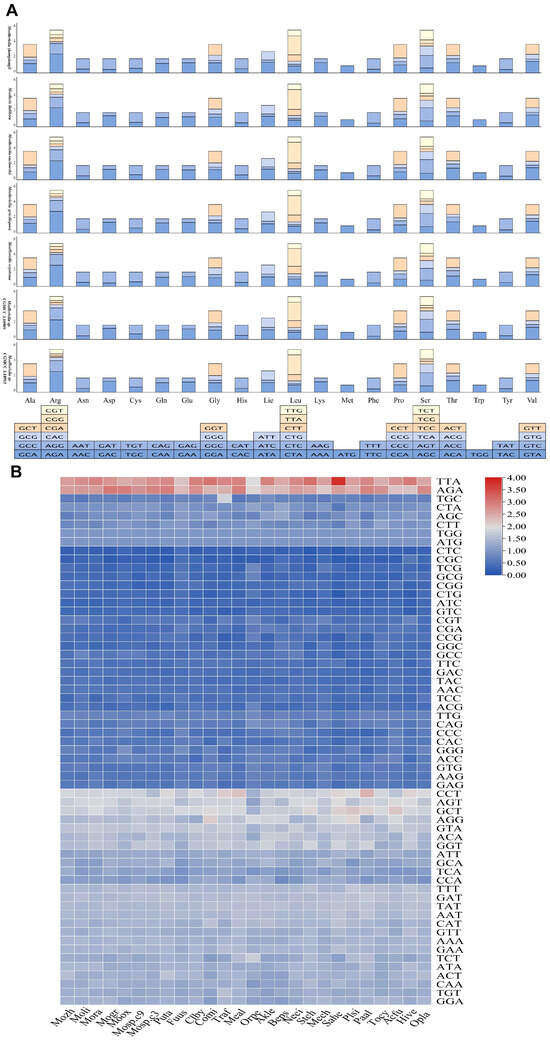 (A) Stacked column plots of the RSCU of the seven Moelleriella mitogenomes. (B) Heatmap of the RSCU of the mitogenomes of 26 Hypocreales species.