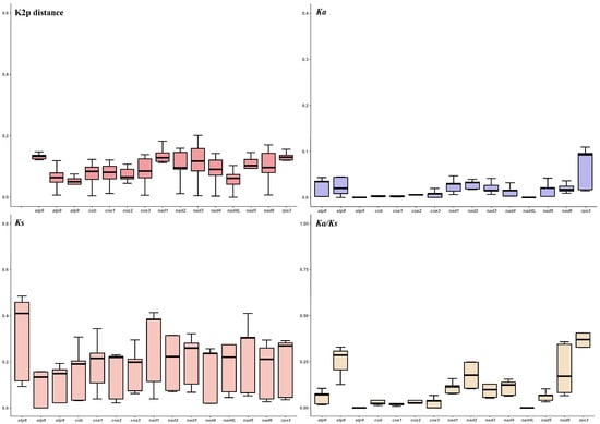 Genetic analysis of the 15 protein–coding genes (PCGs) conserved in the seven Moelleriella mitogenomes. K2P, the Kimura–2–parameter distance; Ka, the mean number of nonsynonymous substitutions per nonsynonymous site; Ks, the mean number of synonymous substitutions per synonymous site.