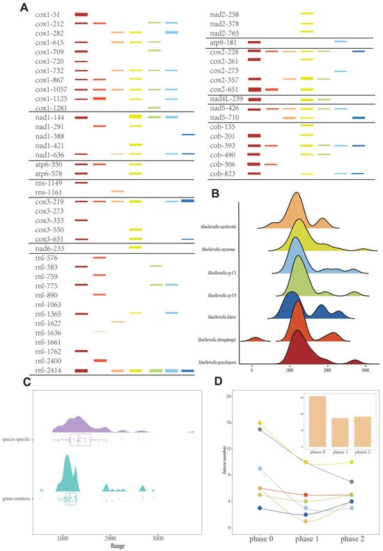 Intron position sets (IPSs) in mitogenomes of the genus Moelleriella and characteristics of the introns of Moelleriella species. (A) Bar graph indicating intron dynamics among seven Moelleriella species. Intron insertion positions were referred to coding sequences of the M. gracilispora genes. The height of each bar corresponded to its respective intron length. (B) The length distribution of the total introns of the Moelleriella species. (C) Box plots indicate length distributions of common introns and species–specific introns, respectively. (D) Codon phase distributions of intron insertion position.