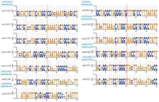 Introns are prevalent in fungal mitogenomes and are mainly divided into groups I and II, with the cox1 gene usually containing the largest number of introns, and intron polymorphisms affect the size and evolution of fungal mitotic genomes [55,56,57]. IPS analyses were used to delineate and compare the location of intron insertions. These analyses revealed that intron insertion sites exhibit frequent gain/loss dynamics, and none of the introns were shared by all seven Moelleriella species examined. These data are similar to what has been observed in Cordyceps and other fungi [58]. Approximately 5–10% of group I introns typically carry HEGs that can potentially act as mobile genetic elements [59]. A total of 138 introns were identified in our Moelleriella analysis, most of which were group I with HEGs. While it is unclear which may be “active”, these findings may account for the diversity of intron insertion positions found. In addition, introns were evenly distributed in the Moelleriella mitogenomes, and intron positions in different species were most prevalent between codons (“phase 0”), similar to what has been commonly described [60]. Overall, the fact that the Moelleriella species examined share a small number of intron insertion positions suggests the loss of ancestral introns and large changes in intron insertion positions during evolution. We further assessed the conservation of the nucleotide sequences around identical IPSs in the Moelleriella species and found that the insertion sites displayed certain base preferences.