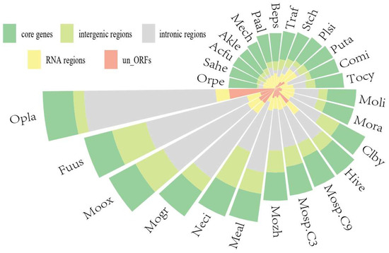 A comparative analysis of the mitogenomes of 26 species within the Hypocreales, including the seven Moelleriella species described herein was conducted. The sizes of the genomes exhibited considerable variability, ranging from 23,794 bp (Orbiocrella petchii) to 117,560 bp (Ophiocordyceps lanpingensis), with a mean value of 48,485 bp (Figure 6, Table S1). Furthermore, the proportion of the five fractions (un_ORFs, intronic regions, intergenic regions, RNA regions, and core PCGs) varies between different species. Core PCGs and RNA regions account for more than 60% of the mitogenome in fungi, such as Purpureocillium takamizusanense and Cordyceps militaris, and only 1/3 or less in other species. The proportion of intergenic regions ranged from 3.22% to 28.01% across different species; meanwhile, un_ORFs percentages ranged from 0.50% to 20.02% across species. Conversely, in fungi, such as Samsoniella hepiali, Cordyceps militaris, and Orbiocrella petchii, there is no un_orf (Figure 6, Table S1).
