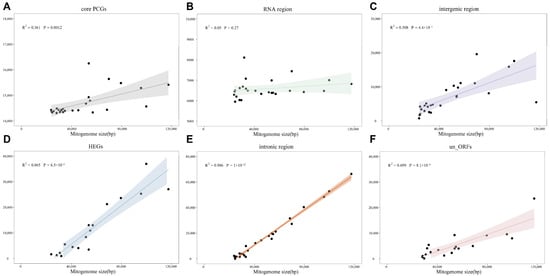 Correlation analysis between the lengths of mitogenomes and the lengths of (A) core PCGs, (B) intergenic region, (C) HEGs, (D) RNA region, (E) intronic region, and (F) un_orf.