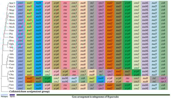 Gene order analyses for 26 Hypocreales mitogenomes. The same gene is represented by the same background color. All genes (fifteen core PCGs and two ribosomal RNAs) are shown in the order of their appearance in the mitogenome, starting with cox1.