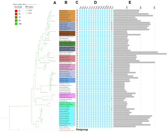 A phylogenetic tree inferred from concatenated mitogenomic PCGs of 70 species, based on Bayesian inference (BI) and Maximum likelihood (ML) methods. (A,B) Tree topology and species list showing the branching of lineages. The bootstrap values of tree nodes were color–coded. Nodes marked with red and blue points indicated BPP values equal to [0.9, 1] and <0.9, respectively. Genera containing ≥ 3 species were filled with the same colors in the species list. (C) GC contents. (D) The colored blocks represents the presence of fungal standard PCGs in the related species. (E) Genome sizes of corresponding mitogenomes.