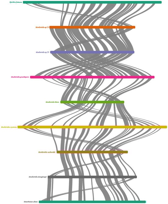 Synteny analysis of seven Moelleriella species, with Metarhizium album and Epichloe festucae. Grey arcs represent homologous regions greater than 500 bp.