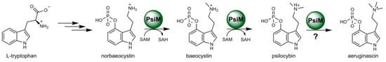 The biosynthetic pathway of psilocybin originates from L-tryptophan, which undergoes decarboxylation, oxygenation and phosphate ester formation to yield norbaeocystin, followed by methylation by the PsiM enzyme. SAM (S-adenosyl-L-methionine) acts as a methyl donor, while SAH (S-adenosyl-L-homocysteine) is the byproduct. A third methyl transfer by PsiM to yield aeruginascin has been proposed. Reprinted from Hudspeth et al. 2024 [], under a Creative Commons Attribution 4.0 International License.