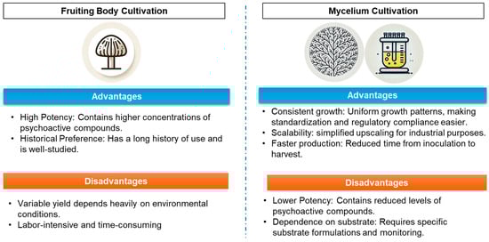In conclusion, both mycelial and fruiting body cultivation offer distinct advantages and challenges for psilocybin production. Mycelium, particularly when grown using submerged fermentation, holds promise for scalable, consistent production, while fruiting bodies remain a reliable source of high psilocybin content. Figure 3 and Figure 4 summarize a comparison of the two cultivation methods for Psilocybe species, highlighting their respective advantages and disadvantages. Further research into both growth methods is essential to fully understand the biosynthetic potential of Psilocybe spp. and develop optimized cultivation protocols for therapeutic and industrial applications.