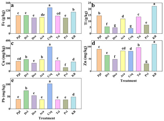 Metal element (Fe (a), Ti (b), Cu (c), Zn (d), and Pb (e)) contents in rhizosphere soil samples. Different letters indicate significant differences between samples (p < 0.05). KB, soil sample from the ilmenite area without plants; Ppl, rhizosphere soil of Polygonum plebeium; Dvi, rhizosphere soil of Dodonaea viscosa; Dco, rhizosphere soil of Dryopteris coreano-montana; Aca, rhizosphere soil of Alhagi camelorum; Ceq, rhizosphere soil of Casuarina equisetifolia; Tsi, rhizosphere soil of Tournefortia sibirica; and Pvi, rhizosphere soil of Pteris vittate.