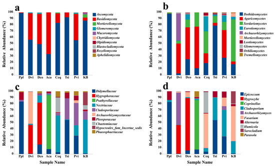 A total of 14 fungal phyla were detected across all soil samples. Our study analyzed variations in abundance among the top ten most prevalent phyla (Figure 4a). The figure illustrates that Ascomycota was the most abundant phylum across all soil samples, followed by Basidiomycota, Mortierellomycota, and Glomeromycota. When compared to the KB group, an increase in Basidiomycota abundance was observed in the rhizosphere soil of all plants except Ppl, whereas the abundance of Mortierellomycota decreased.