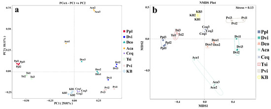 Principal Coordinate Analysis (PCoA) (a) and Nonmetric Multidimensional Scaling (NMDS) analysis (b) were performed between different samples based on the weighted UniFrac distance. KB, soil sample from the ilmenite area without plants; Ppl, rhizosphere soil of Polygonum plebeium; Dvi, rhizosphere soil of Dodonaea viscosa; Dco, rhizosphere soil of Dryopteris coreano-montana; Aca, rhizosphere soil of Alhagi camelorum; Ceq, rhizosphere soil of Casuarina equisetifolia; Tsi, rhizosphere soil of Tournefortia sibirica; and Pvi, rhizosphere soil of Pteris vittate.