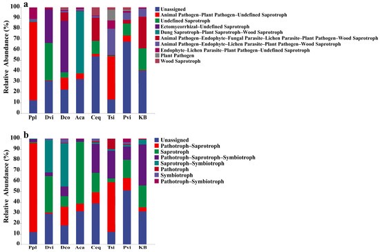 The FunGuild prediction results revealed enrichment of Unassigned, Animal Pathogen–Plant Pathogen–Undefined Saprotroph, and Undefined Saprotroph guilds. The guilds enriched by fungi in the rhizosphere soils of different plants differed (Figure 10a). Compared with those of the KB group, the rhizosphere soils of different plants were enriched in different fungal guilds: the Ppl sample enriched in the Animal Pathogen–Plant Pathogen–Undefined Saprotroph and the Endophyte–Lichen Parasite–Plant Pathogen–Undefined Saprotroph guilds; the Tsi sample enriched in the Animal Pathogen–Endophyte–Lichen Parasite–Plant Pathogen–Wood Saprotroph and Plant Pathogen guilds; the Dvi sample enriched in the Undefined Saprotroph guilds; the Aca sample enriched in the Dung Saprotroph–Plant Saprotroph–Wood Saprotroph and Animal Pathogen–Dung Saprotroph–Endophyte–Lichen Parasite–Plant Pathogen–Undefined Saprotroph guilds; the Dco sample enriched in the Lichen Parasite–Plant Pathogen–Wood Saprotroph, Ectomycorrhizal–Undefined Saprotroph, and Plant Pathogen–Undefined Saprotroph guilds; and the Pvi sample enriched in Undefined Saprotrophic–Wood Saprotroph, and Ectomycorrhizal–Fungal Parasite–Soil Saprotroph–Undefined Saprotroph guilds. In addition, different plants also cause different modes of rhizosphere fungi. Compared with those of the KB sample, the fungal mode of the Ppl sample was Pathotroph–Saprotroph; the fungal mode of the Tsi sample was Pathotroph; the fungal mode of the Dvi sample was Saprotroph–Symbiotroph; the main modes of the fungi in the Dco sample were Saprotroph–Symbiotroph and Symbiotroph; the main modes of the Pvi sample were Pathotroph–Symbiotroph and Unassigned; the main mode of the Aca sample was Saprotroph; and the main modes of the Ceq sample were Unassigned and Pathotroph–Saprotroph–Symbiotroph.