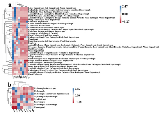 Based on FunGuild’s classification, the soil fungi present in the samples could be categorized into 97 distinct functional groups (Figure 8). Among these guilds, Unassigned accounted for the largest proportion (average 28.01%), and the other guilds included Animal Pathogen–Plant Pathogen–Undefined Saprotroph (average 16.29%), Undefined Saprotroph (average 9.12%), Ectomycorrhizal–Undefined Saprotroph (average 8.71%), and Dung Saprotroph–Plant Saprotroph–Wood Saprotroph (average 7.15%). The abundance of guilds was different in each sample. The trophic modes of all the soil samples were divided into eight types. Among them, the Unassigned trophic mode accounted for the largest proportion (average 28.02%), followed by the other trophic modes, followed by Pathotrophs–Saprotrophs (average 22.76%), Saprotrophs (average 20.27%), Pathotrophs–Saprotrophs–Symbiotrophs (average 15.44%), Saprotrophs–Symbiotrophs (average 10.08%), Pathotrophs (average 1.62%), Symbiotrophs (average 1.16%), and Pathotrophs–Symbiotrophs (average 0.50%).