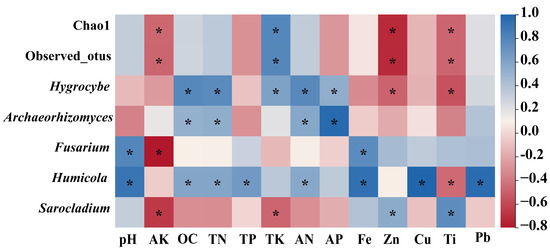 Correlation analysis of alpha diversity index and top ten fungal genera in abundance with soil physicochemical properties. The color bar in the upper right corner represents the correlation coefficient value, with blue representing a positive correlation and red representing a negative correlation. The asterisk indicates that the correlation reached a significant level (p < 0.05).