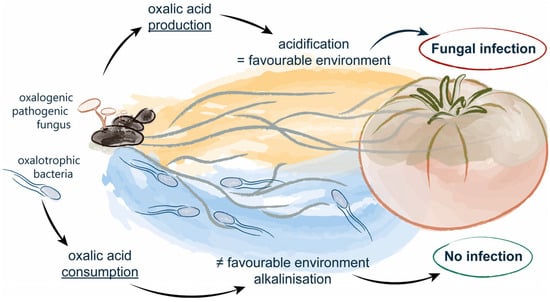 This propensity of the organisms involved in the OCP to modify the pH is the basis for the hypothesis of oxalotrophy as an effective biocontrol strategy that not only affects the pathogen, but also results in the modification of the local environment (Figure 1). Several studies have shown that oxalotrophic bacteria are indeed able to protect Arabidopsis thaliana, Phaseolus vulgaris, and other crops against Sclerotinia sclerotiorum, Sclerotium rolfsii, and Botrytis cinerea, three phytopathogenic fungi producing oxalic acid [3,29,30]. Both in vitro and field experiments have shown a significant reduction in disease incidence with the addition of oxalotrophic bacteria. However, none of these studies evaluated how the consumption of oxalic acid and the subsequent alkalinisation of the medium would interfere with fungal growth or how other nutritional factors could influence the interaction between oxalotrophic bacteria and the phytopathogenic fungus.