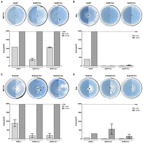 Figure 2. Soft agar confrontation assays between wild-type Sclerotinia sclerotiorum and the non-oxalogenic Δoah mutant and oxalotrophic bacteria Cupriavidus necator and Cupriavidus oxalaticus on MA1/10 (A,C) and R2A (B,D). (A,B) From left to right: WT S. sclerotiorum (SsWT), WT S. sclerotiorum and C. necator (SsWT + Cn); WT S. sclerotiorum and C. oxalaticus (SsWT + Co). (C,D) From left to right: Δoah S. sclerotiorum (SsΔoah); Δoah S. sclerotiorum and C. necator (SsΔoah + Cn); Δoah S. sclerotiorum and C. oxalaticus (SsΔoah + Co). The left half of the picture was taken after four days of incubation, and the right half—after 30 days of incubation. The area of mycelial growth was measured with ImageJ and plotted with the mean and the standard error of the mean in triplicates. After four days, the fungal growth area in the presence of C. necator or C. oxalaticus was significantly different from the control (p-values < 0.05) for both fungi on both media, while after 30 days, fungal growth was only significantly different on R2A (p-values < 0.05). The dotted line indicates the maximum area of the plate.