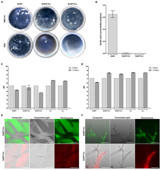 Figure 3. Confrontation assays in cell culture Petri dishes with WT S. sclerotiorum. (A) Images illustrating the growth on malt broth (MB1/10) on top and on Reasoner’s 2A broth (R2B) on the bottom; from left to right: WT S. sclerotiorum (SsWT); WT S. sclerotiorum and C. necator (SsWT + Cn); WT S. sclerotiorum and C. oxalaticus (SsWT + Co). (B) Corresponding oxalic acid detection in R2B. (C,D) Initial and final pH measurements in MB1/10 (C) and R2B (D). (E,F) Inverted microscopy images in MB1/10 (E) and R2B (F); scale bar = 100 µm. For oxalic acid concentrations (B), the mean of three independent measurements was plotted with the standard error of the mean. The oxalic acid concentration in the presence of C. necator and C. oxalaticus was significantly different from the control (p-values < 0.05). For pH measurements (C,D), the mean of three independent measurements taken at the beginning of the experiment and after 10 days was plotted with the mean and the standard error of the mean. After 10 days, the pH was significantly different from the initial pH in all cases except for WT S. sclerotiorum in the presence of C. necator in MB1/10 (C). The images acquired from the plates showed that C. necator and C. oxalaticus were alive after 10 days in both the MB1/10 and R2B media. The bacteria were found in large clumps away from the hyphae in MB1/10 (E), while they were closely associated with the WT S. sclerotiorum mycelium in R2B (F).