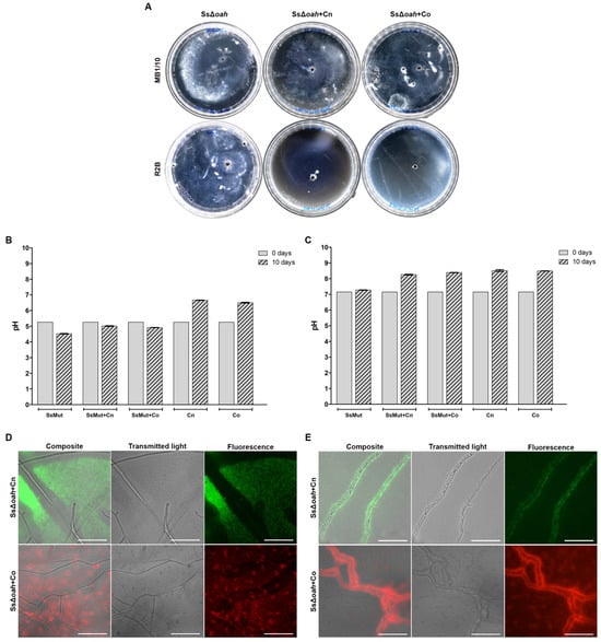 Figure 4. Confrontation assays in cell culture Petri dishes with Δoah S. sclerotiorum. (A) Images illustrating the growth on malt broth (MB1/10) on top and on Reasoner’s 2A broth (R2B) on the bottom; from left to right: Δoah S. sclerotiorum (SsΔoah); Δoah S. sclerotiorum and C. necator (SsΔoah + Cn); Δoah S. sclerotiorum and C. oxalaticus (SsΔoah + Co). (B,C) Initial and final pH measurements in MB1/10 (C) and R2B (D). (D,E) Inverted microscopy images in MB1/10 (D) and R2B (E); scale bar = 100 µm. For pH measurements (B,C), the mean of three independent measurements taken at the beginning of the experiment and after 10 days was plotted with the mean and the standard error of the mean. After 10 days, the pH was significantly different from the initial pH in all cases. The images acquired from the plates showed that C. necator and C. oxalaticus were alive after 10 days in both the MB1/10 and R2B media. The bacteria were found in large clumps away from the hyphae in MB1/10 (D), while they were closely associated with the Δoah S. sclerotiorum Δoah mycelium in R2B (E).